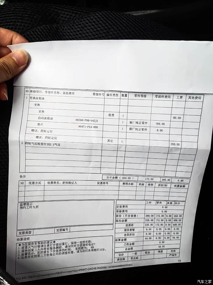 一眨眼,飞仔下地就六年了,从15KM开始陪伴着我和我的家人们,六年来,它任劳任怨,埋头苦干,与我们一家人相处得其乐融融!渐渐地,我们感情也越来越深、越来越好!也因此一直坚持在4S保养,虽然没有用最贵的机油,但还是坚信那道理——只买对的,不买贵的!所以保养频率大概在7000公里上下……现在她也小跑了七万公里了,是时候给她换个变速箱油了,趁着买车险送了两百元保养券以及去年送的四轮定位券,就赶在过期前抓紧去把他们用了……