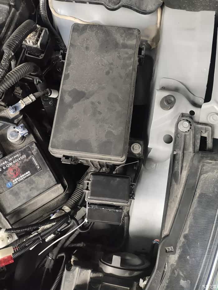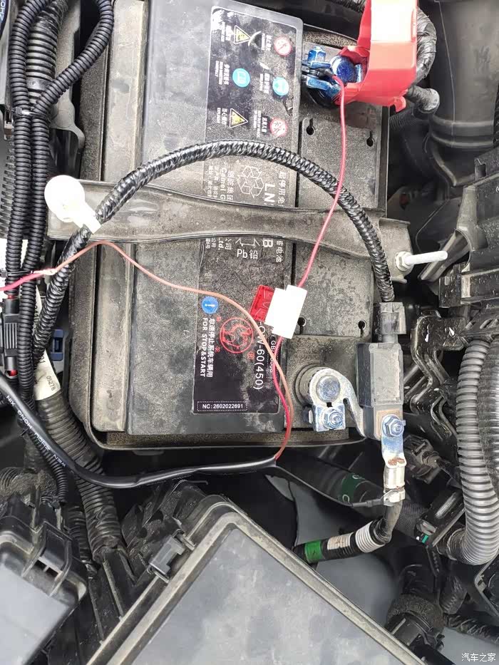 借电的路线走向,红白相间的及正极旁边那个黑色的均为保险丝。控制盒之所以用白色的轧带捆绑,因为我打胶了固定一下,用的硅酮结构胶。之前没有打胶固定,只用的轧带,上高速有异响。然后处理了一下。胶强度上来后就把轧带剪掉。