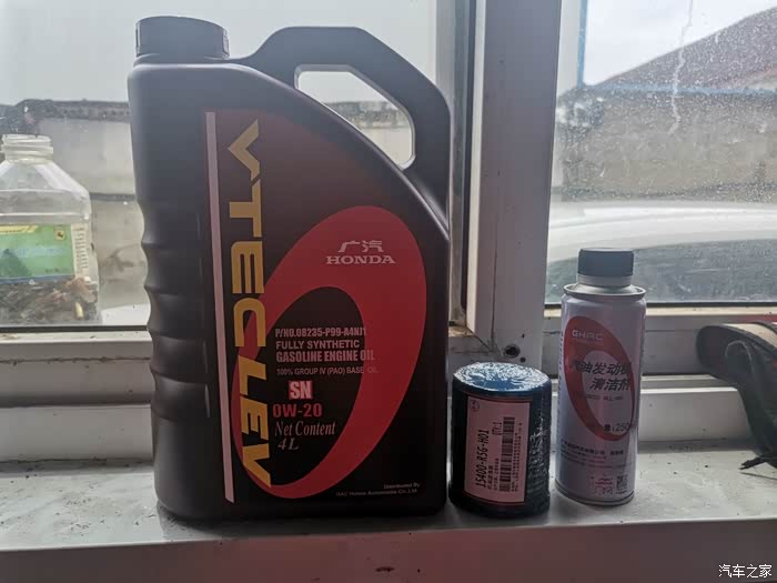工作人员把保养用品拿来啦。从左往右依次是 机油、机油滤芯,燃油清洁剂。其中最为重要的就是更换机油跟机油滤芯,一般有两种机油,一中是蓝色包装矿物质机油,另一种就是紫色包装全合成机油,紫色包装的比蓝色包装的售价要高一些,机油滤芯一般都没有太大差别,都是原厂的,燃油清洁剂也是可以自己购买和添加的。