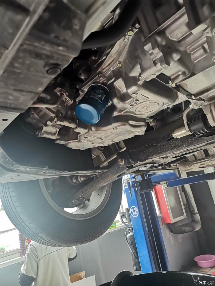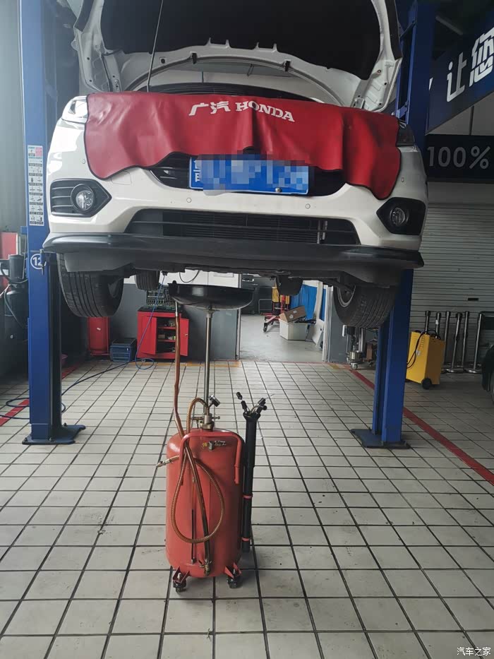 小智被升起来了,先把之前的机油都放出来,被放出来的机油有点发黑,大约四五分钟就放完了,下面那个橙红色的圆桶就是接放出来废弃机油的,这期间工作人员还给检测了车胎,胎压。