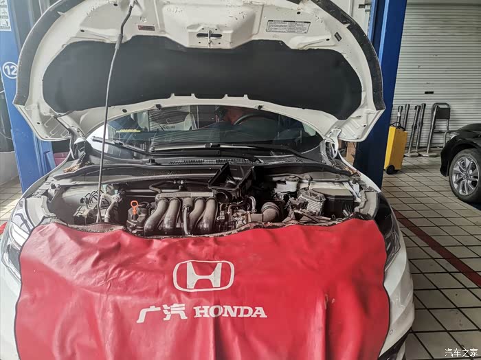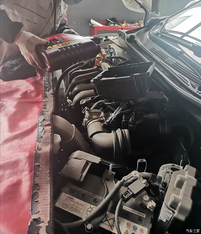 工作人员先用气枪把前倾盖上面下面隐藏的灰尘、树叶清洁了一下,然后打开前倾盖,还盖上了一个红色的油布,是不是感觉萌萌哒,感觉有点像小孩子吃饭时带着的口水巾。这期间,工作人员还会检查一下空气滤清器和空调滤清器,我平时一般不开车,这两个部件还是挺新的,所以暂时都不需要更换。