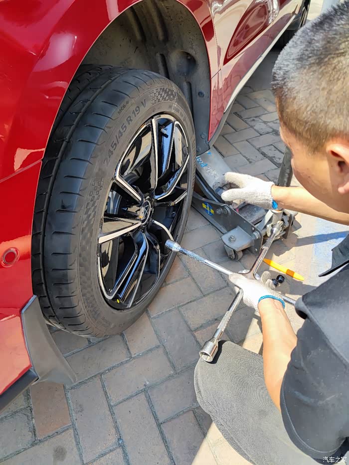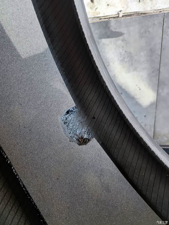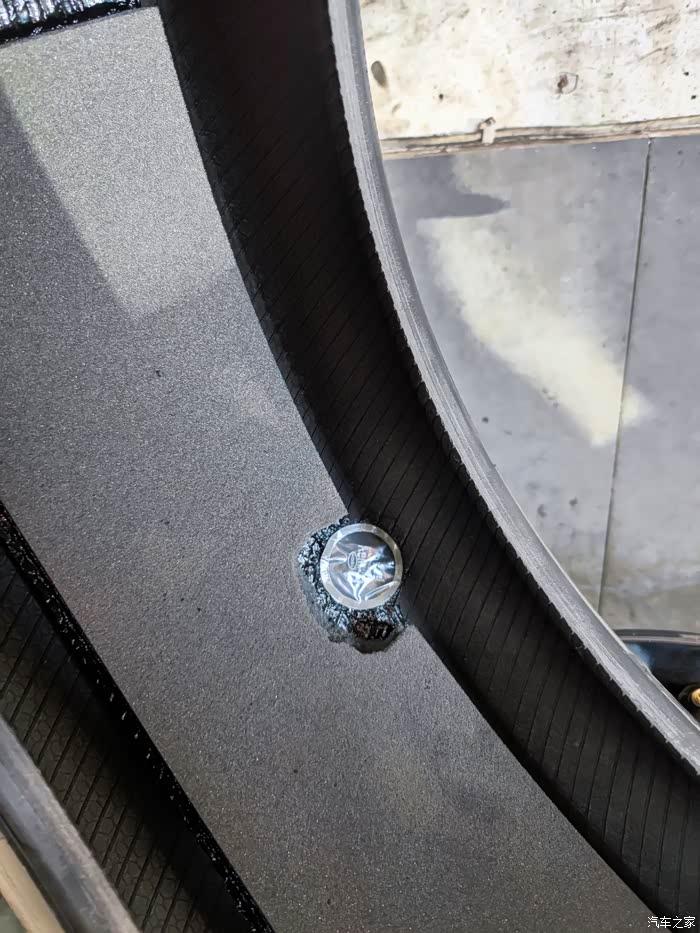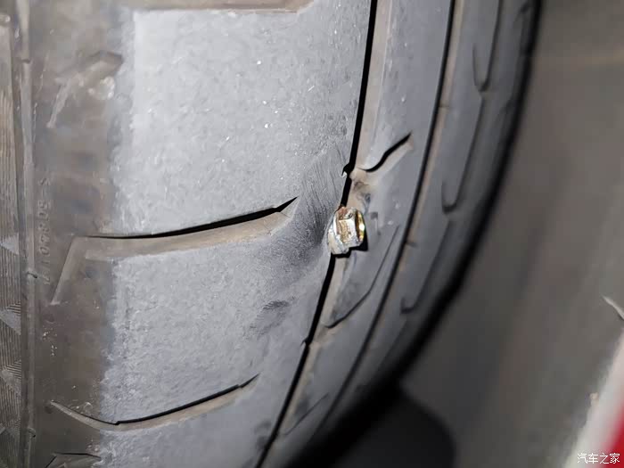 前天晚上十点多开车回到车库,下车就听到嘶嘶的声音,循着声音仔细一查,发现是右后轮扎了个钉子。这时胎压还没降下去还没报警,所以应该是才扎到的,有可能就是车库里扎到的。这么晚了,也没法补胎了,只能第二天早上再去补了。第二天早上下去一看,果然轮胎扁渣渣,贴在地上了,这咋办呢?要不要充气呢?要不要用补胎液呢?