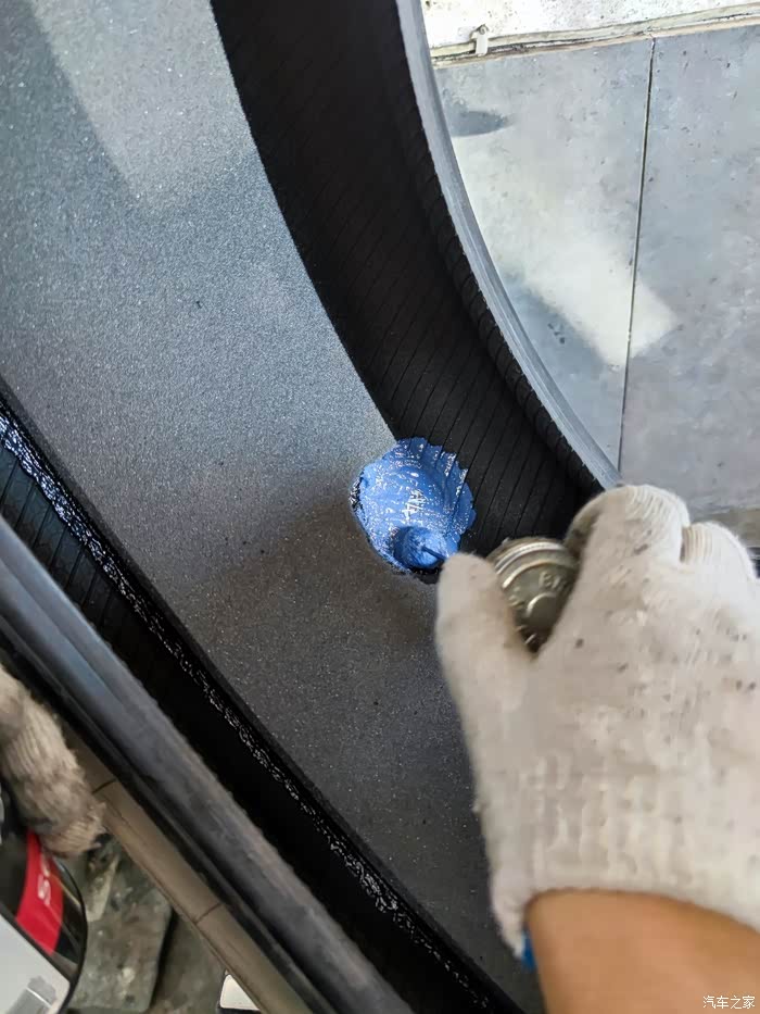 思路理清,那就动手吧。汉的后备箱放了很多行李,充气泵还压在盖板下面,不方便拿出来,我就拿了另一个车的充气泵来给大汉打气。气压充到2.5就可以开走了,附近就有修车店,老板补胎很专业。扒开轮胎之后,要把海绵扣开一小块,清理粘胶,然后就跟普通补胎一样了,用一个补丁贴上,再压平,刷一点密封胶就可以了。装胎,打气,一气呵成,总共十几分钟搞定,费用40元。大汉满血复活。