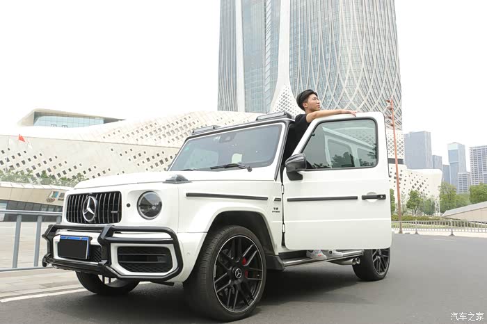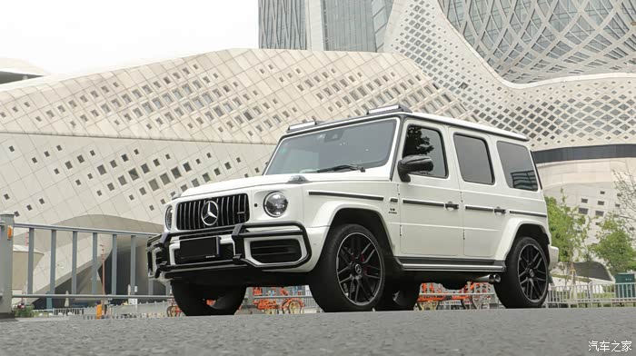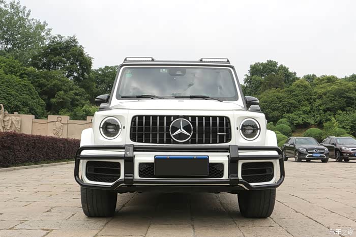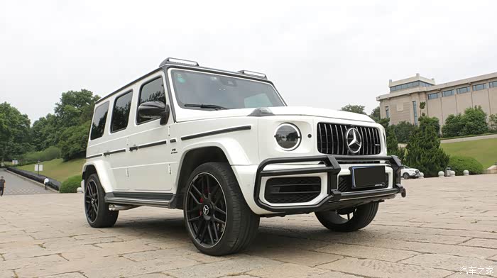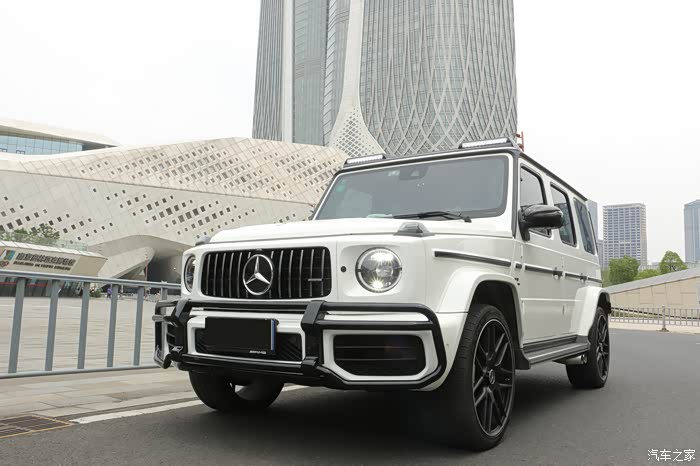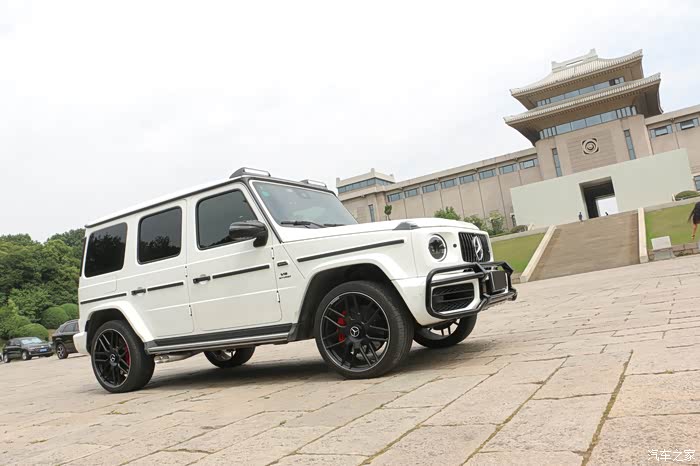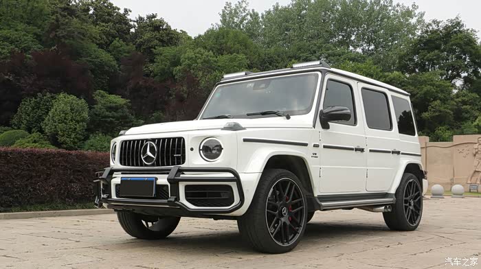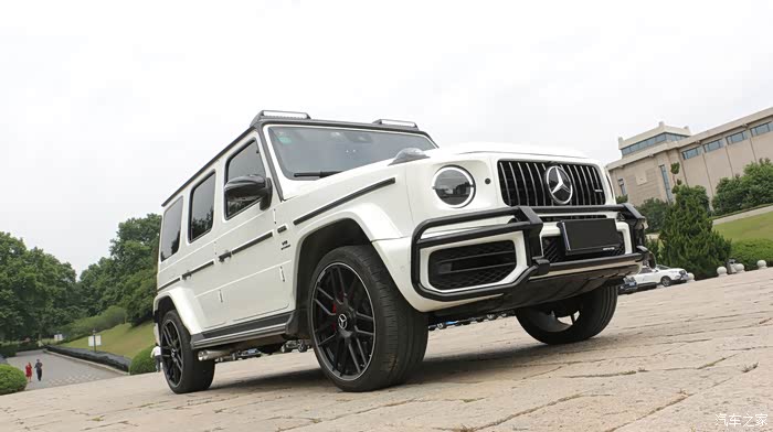 像这一台白色G500,其实并没有升级完美,巴博斯的机盖和前唇合起来,整车会直接上一个档次,更加的完美,车体饱满而宽大,也映衬这前面的金属护杠和碳纤维的顶灯。