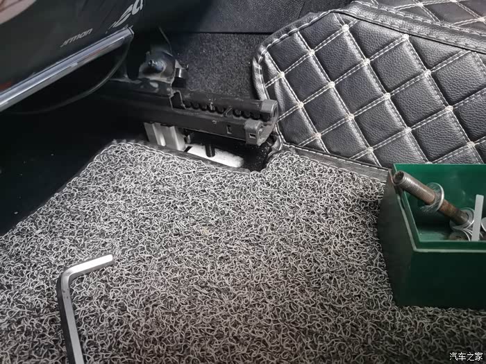 拆卸掉滑轨后面两颗原厂螺丝,从后面抬高座椅,放入垫块。换成10mm??60mm长的内六角螺丝固定座椅。