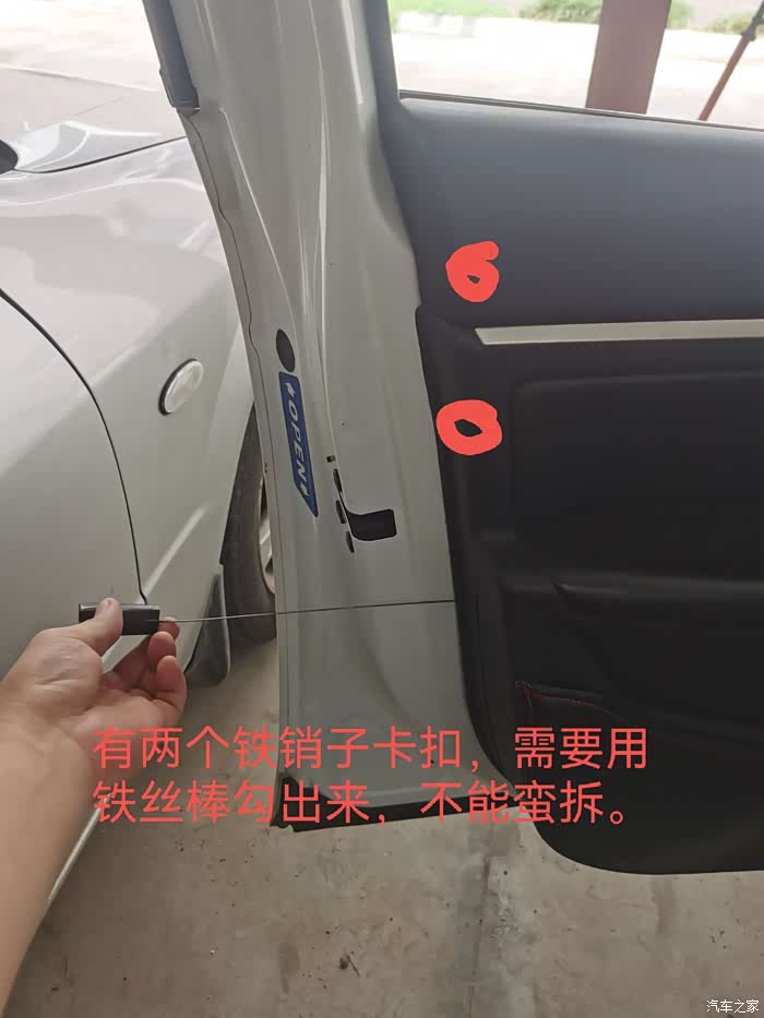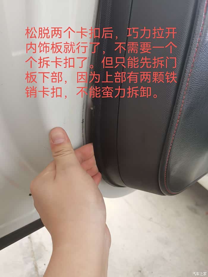 撬棒塞进缝隙中。沿车门下滑 需要先拆下面 因为上面有两颗卡扣是带铁销子的,需要初步拆开门板,给他创造一些间隙,方便拉出铁销子。