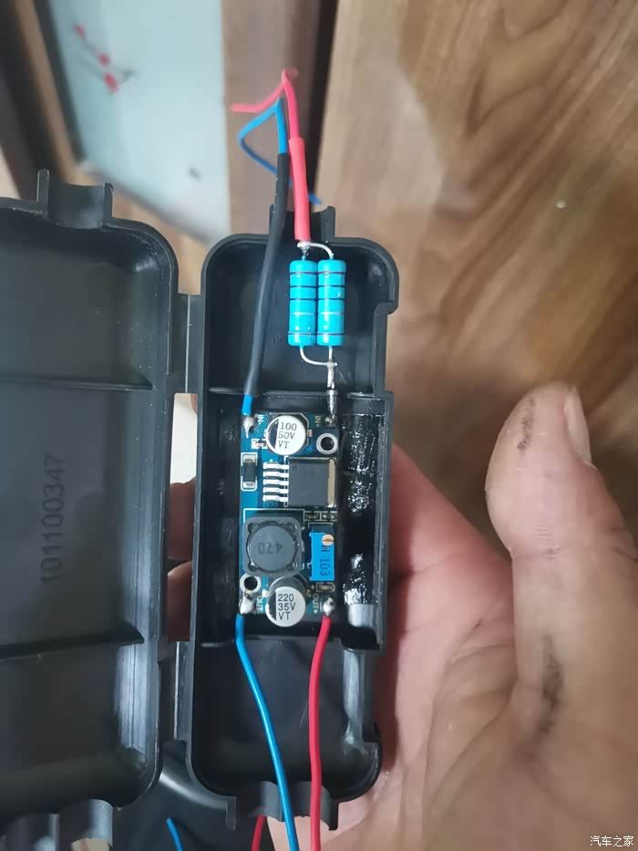 加上可调降压模块,调节输出电压控制灯带亮度,使灯带和尾灯亮度一致,并联了两个10欧姆3瓦的电阻,减小模块通电时产生的电火花问题,加上二极管防止接错正负极损坏模块