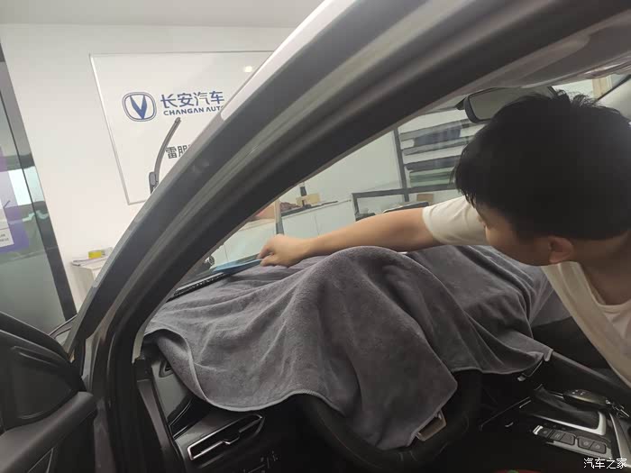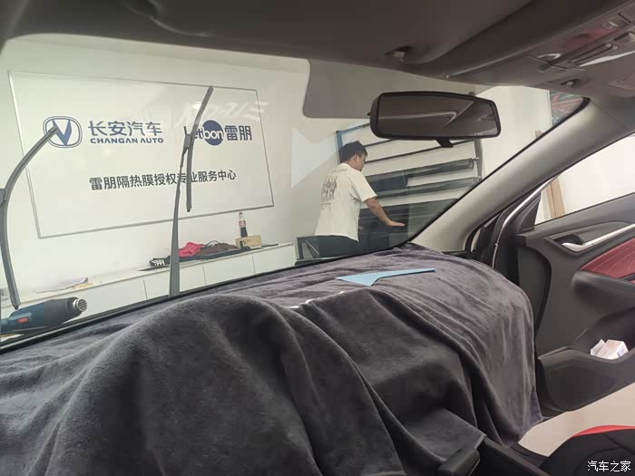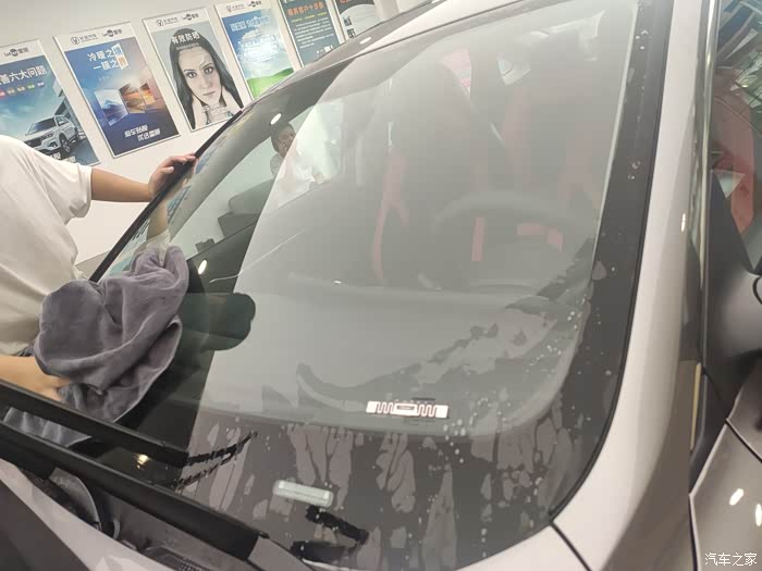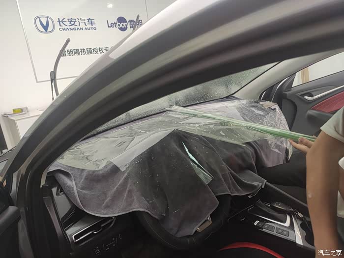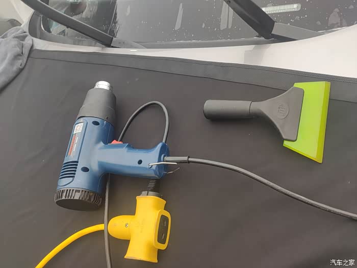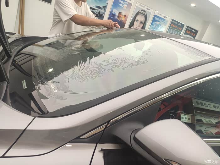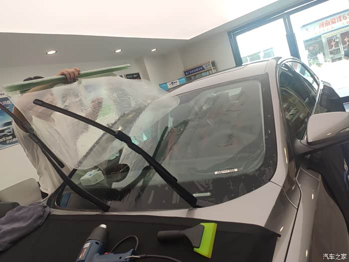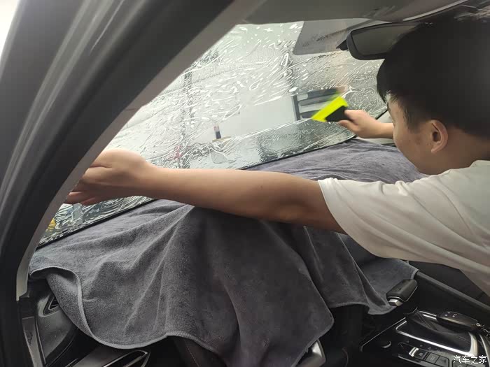用喷壶喷点水,水里面加了贴膜专用泡沫,作业过程中让膜更好的贴到车玻璃上,烤枪把太阳膜烤热,这可是个技术活儿
