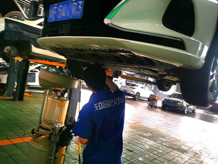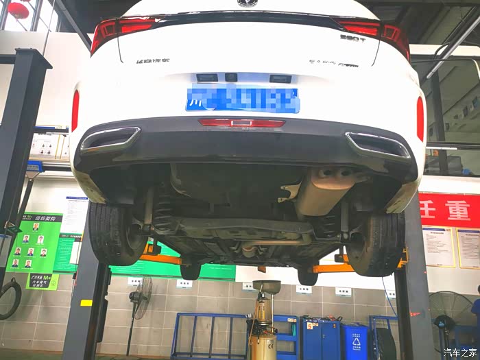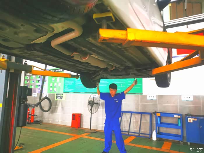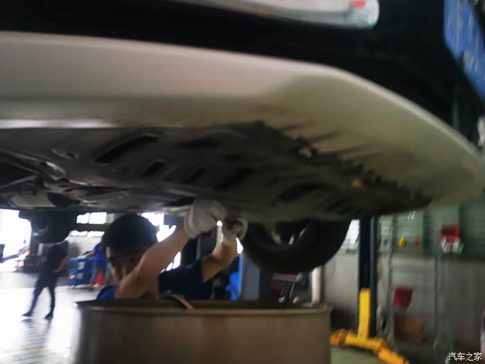 举升机把小逸举起来,准备放旧机油和今检查胎压,底盘螺丝