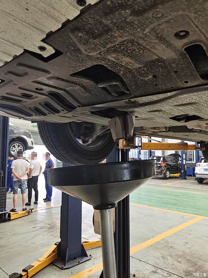 先把车子升起来,把废旧的机油全部放掉,也会换上新的机油!