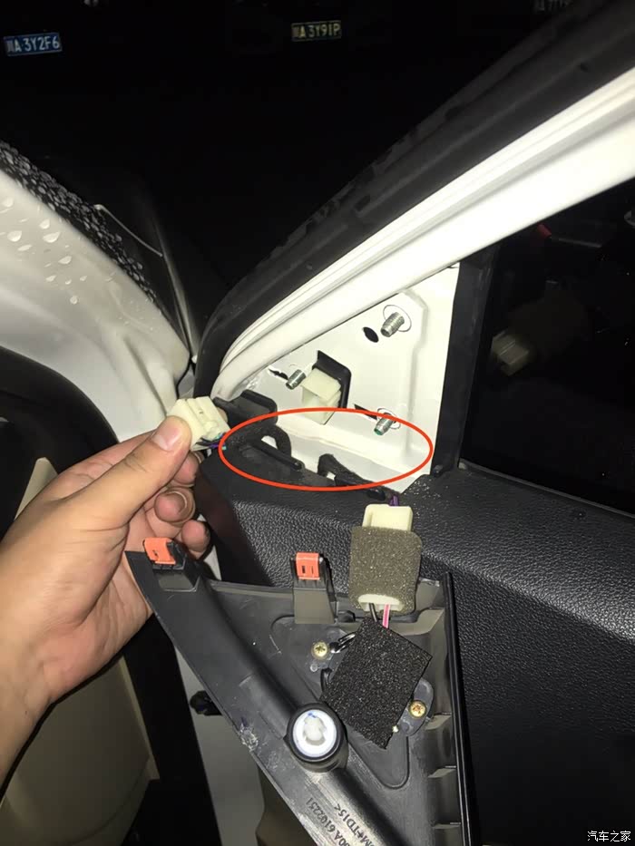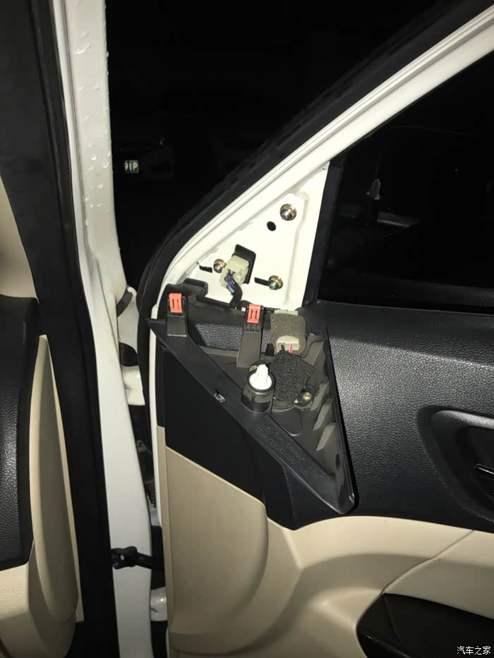 后视镜的拆除,首先需要扣掉小三角位置的内饰板,也就是高音喇叭处。也是这次拆卸,我才知道原车竟然带有高音喇叭。长安够厚道。