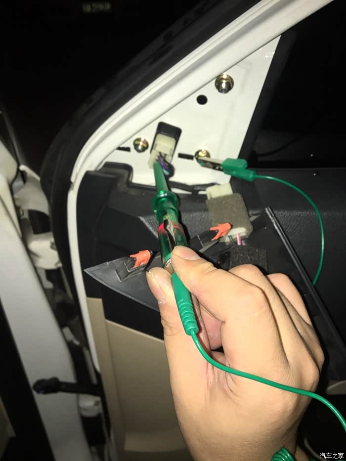 取下后视镜之间还想做个检测,看到底是线路问题还是LED转向灯自身出了问题。新买的工具用上了,车用电笔。就是一个12V灯泡,尾线接地(任意裸露金属),笔尖探测。