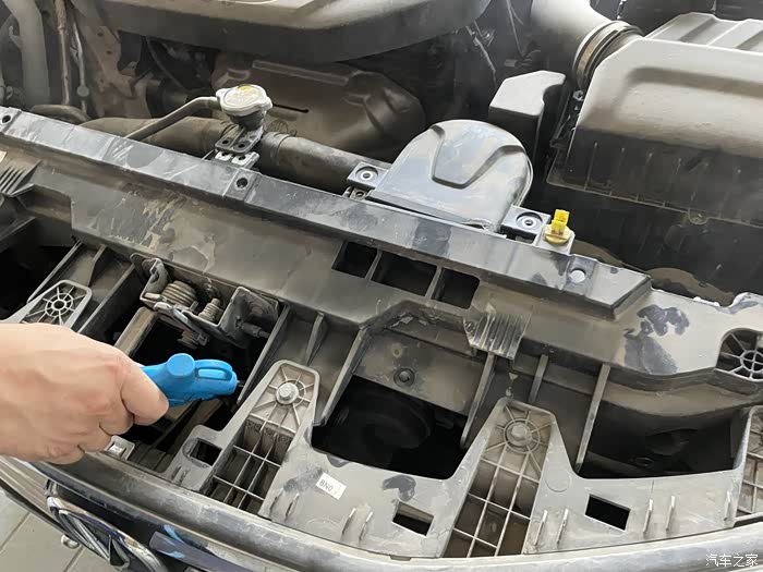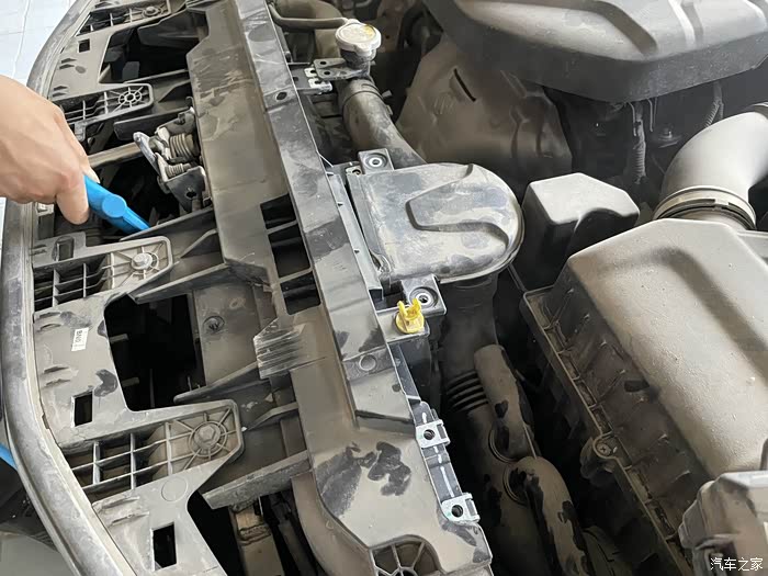打开前机盖,因为拆前保险杠比较麻烦,只需要拆开上面的盖板就行。
