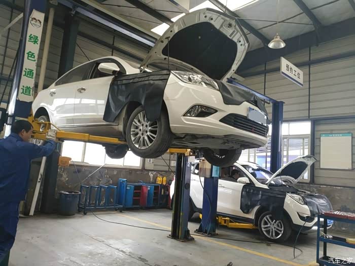 很快爱车已被开进工位,师傅已为它披上马甲,打开了引擎盖