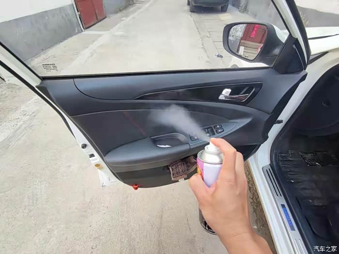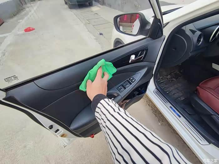 首先把毛巾浸湿, 对内饰板仔细的擦洗一遍。
