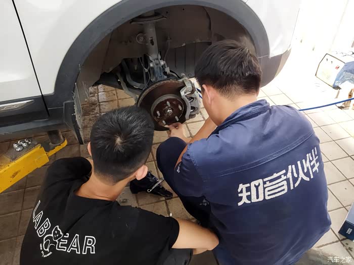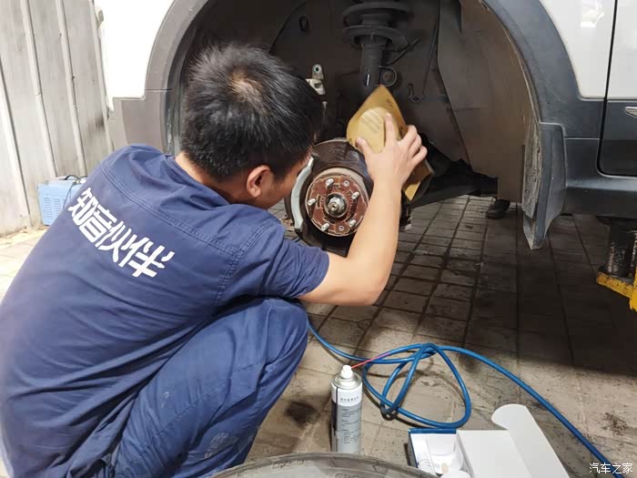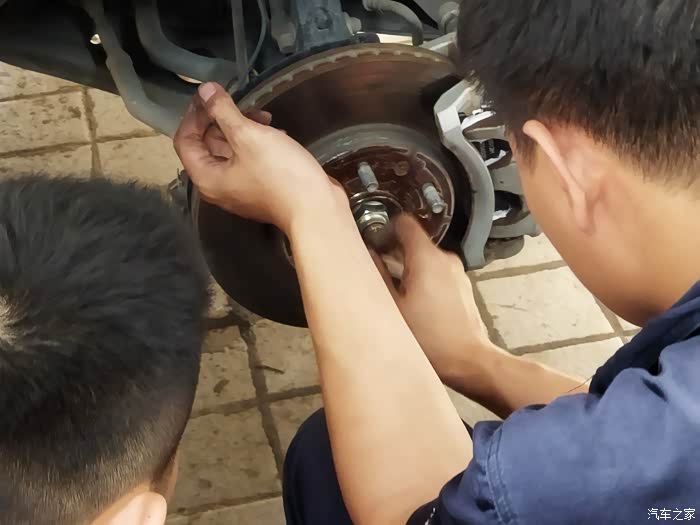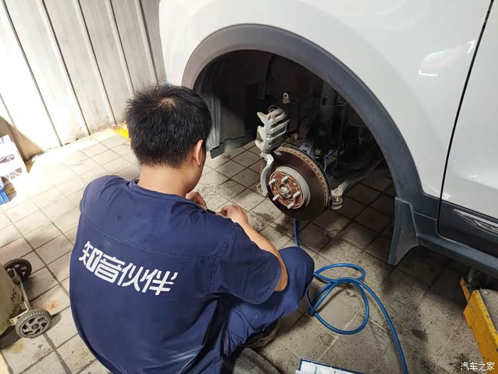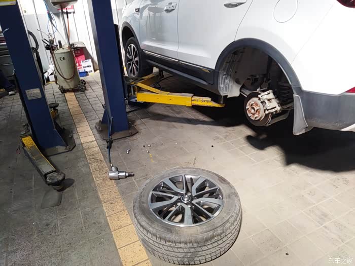 然后利用升降机把车辆稍微升高一点,让轮胎离地,紧接着就开始有条不紊的进行着,整个过程中,师傅表现出来状态都是非常熟练的,从刚开始的轮胎拆卸车到刹车保养完成,每个环节都做的都非常仔细,刹车片也有用沙子打磨一下等等这些,非常专业,不得不说,这次做刹车保养还是挺满意的,4s的售后服务态度还是挺好的,登记询问车辆都挺仔细的,师傅的技能也非常专业,整个过程都是微笑接待的,下面就为大家上图一一分享。