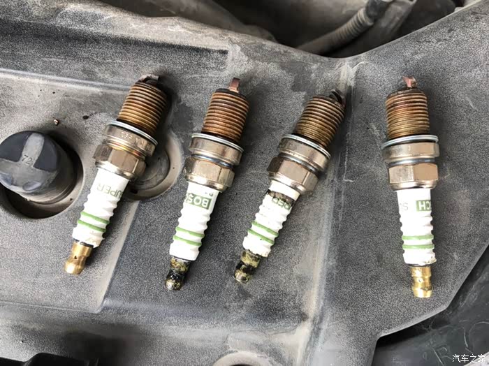 刚刚拆下来的四颗火花塞,积炭有点多