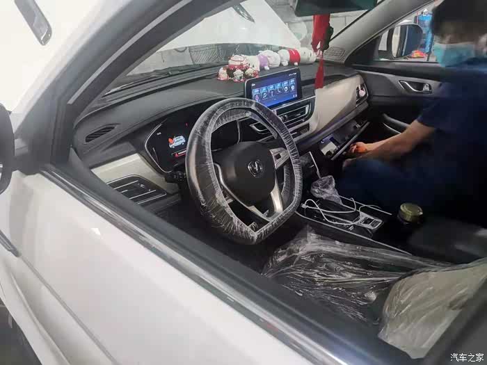 给方向盘和座椅套上塑料保护膜