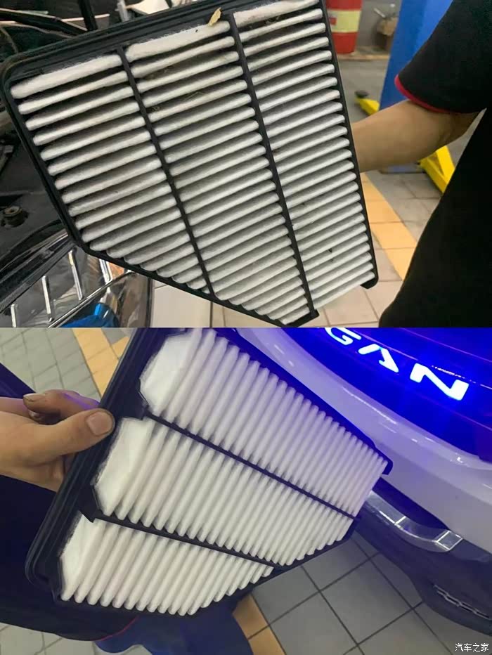 新旧空气滤芯对比,旧滤芯很脏,所以需要及时更换,会给我们带来一个舒适的驾乘空气