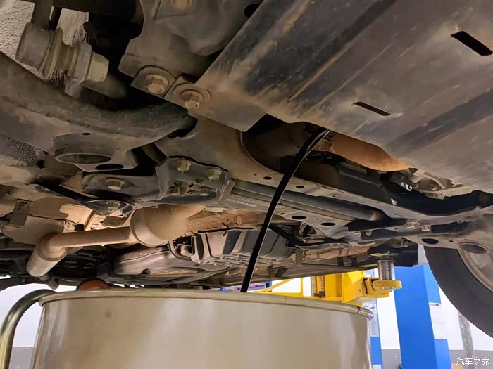 把车升起来然后拧开机油底部的螺丝,需要专用扳手