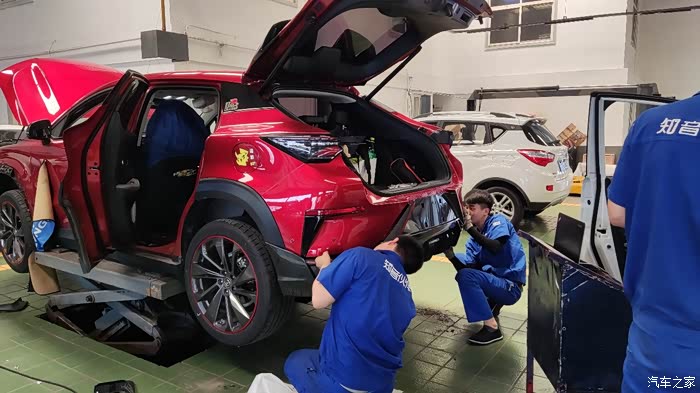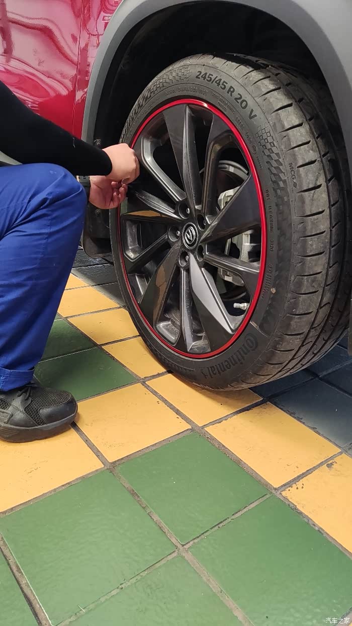 ①师傅先从简单的地方开始整,因为今天车很多,暂时没有工位,所以先把轮毂装饰圈给贴上了。这个轮毂装饰圈就是3M贴上的,没有什么安装难度,不过效果确实是让车的运动感更明显了一些。