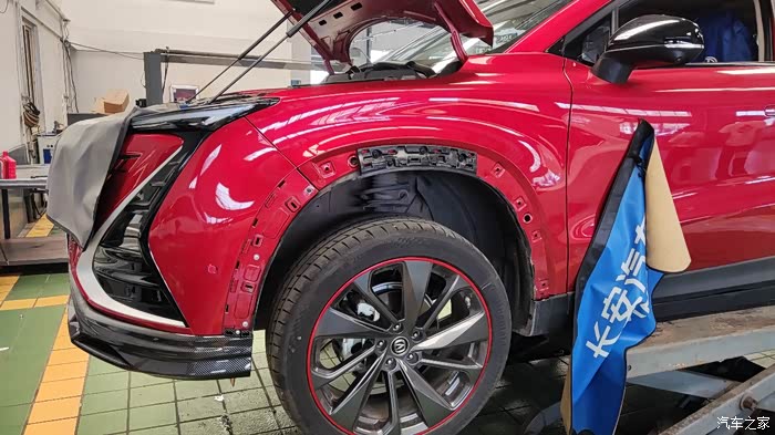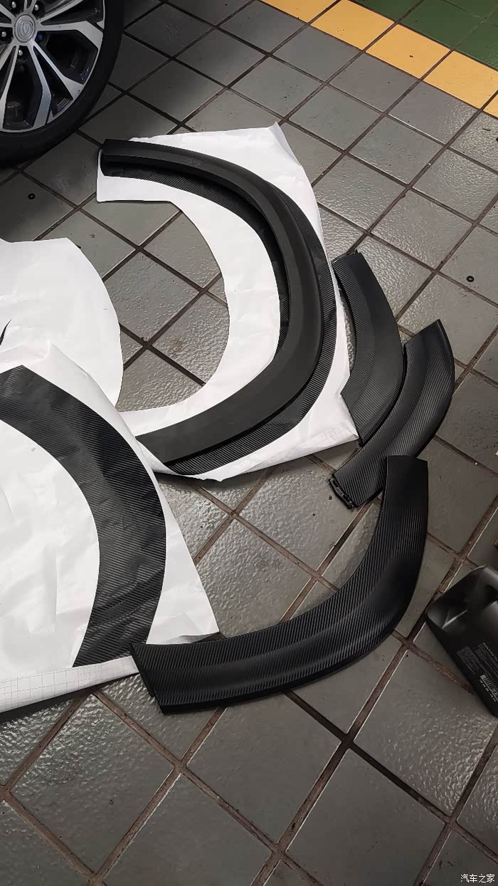 轮眉这里其实是贴碳纤维纹的贴纸的。我是选择了贴轮眉的贴纸,所以师傅需要把轮眉挨个撬下来(包括挡泥板也得拆),贴完贴纸,再安装上去。 Z型装饰条的贴纸给的是红色的,因为我本身是红车,怕顺色,所以选择不贴贴纸,保留了原车的银色装饰条颜色。彩色文字帖纸不是很喜欢,我就没有选择贴。