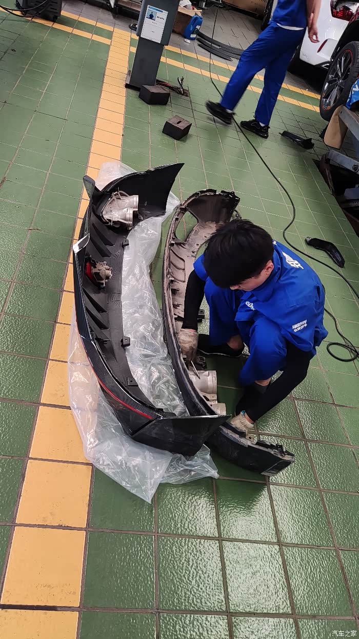⑤接下来是后包围这里,就不是单纯的拆后保险杠了,这是最麻烦的地方。因为多了一块车牌底下梯形的碳纤维纹的区域,所以整个后屁股都要拆下来,原车的后包围有很多的零部件在上面,比如雷达,走线,排气筒,雾灯等等,所以需要把原来后包围上的东西一一拆下来,再安装到新的后包围上去。