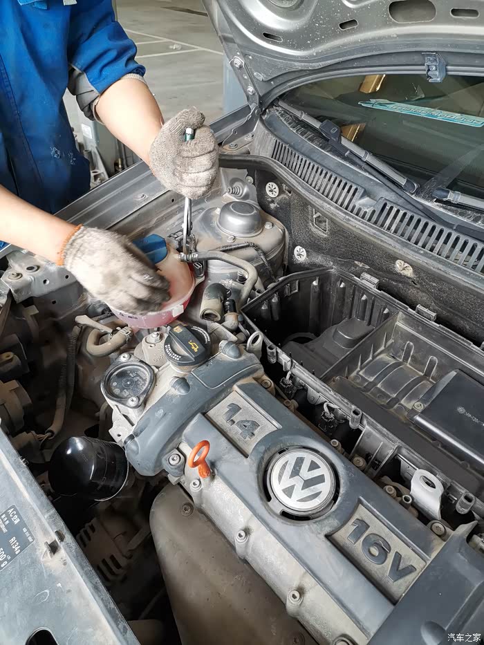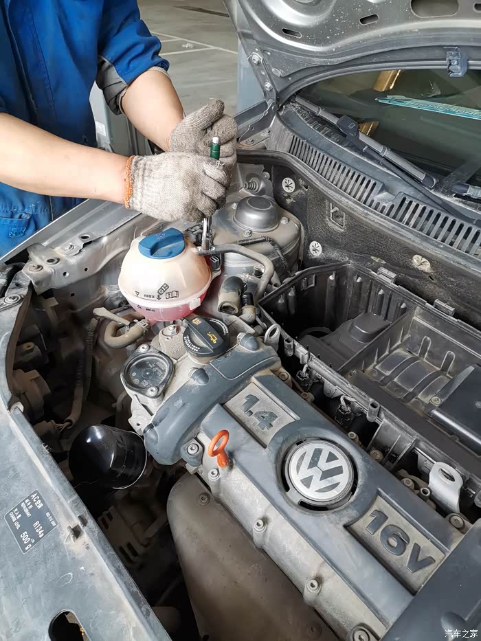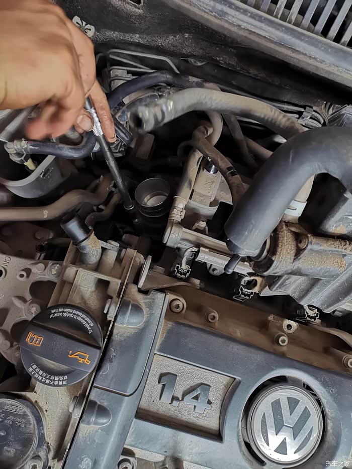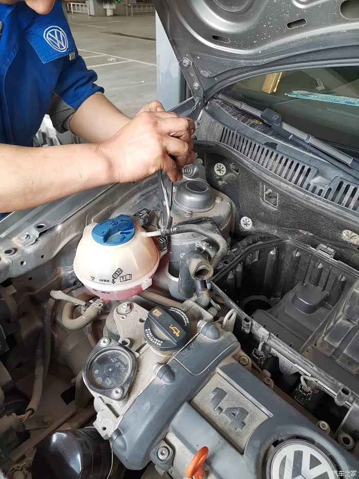 师傅把防冻液壶和节气门的连接软管原样装好。