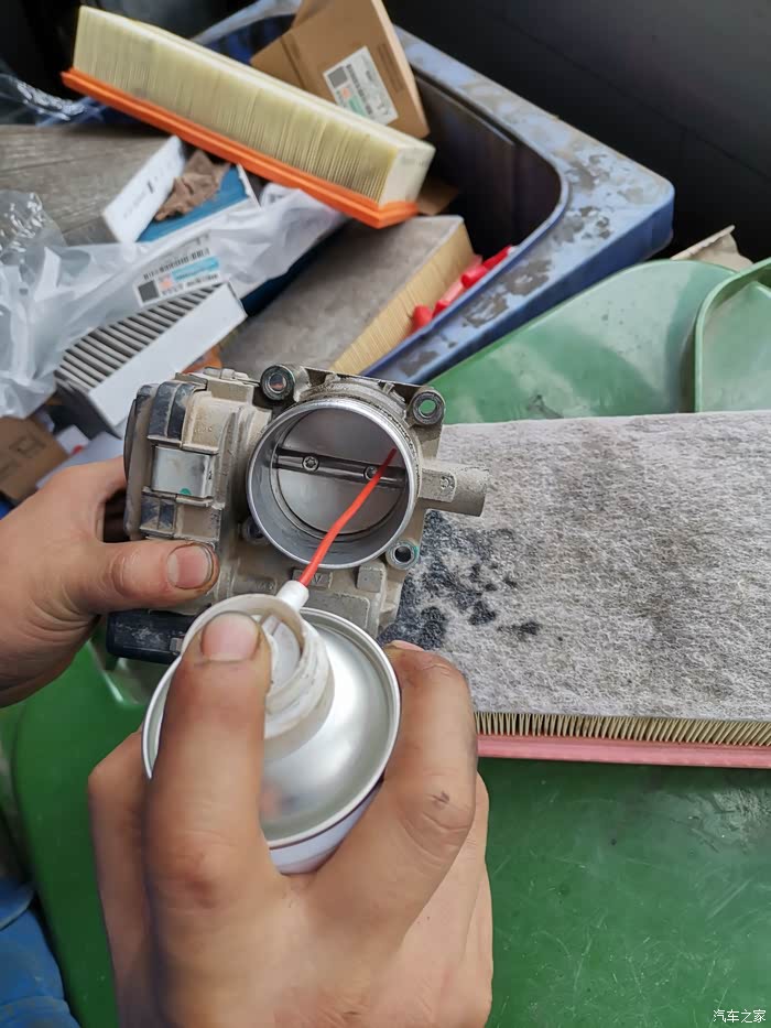 师傅往节气门背面喷少量“化油器清洗剂”然后用涤纶抹布”小心擦洗。