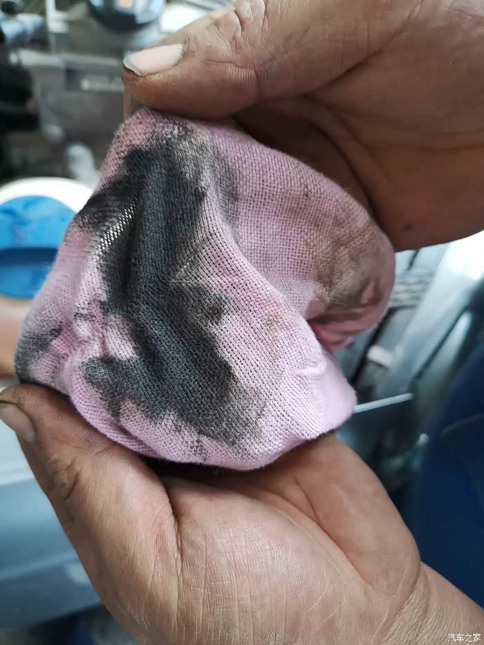 师傅用涤纶抹布擦洗下来的积碳和油泥,还是很脏的。