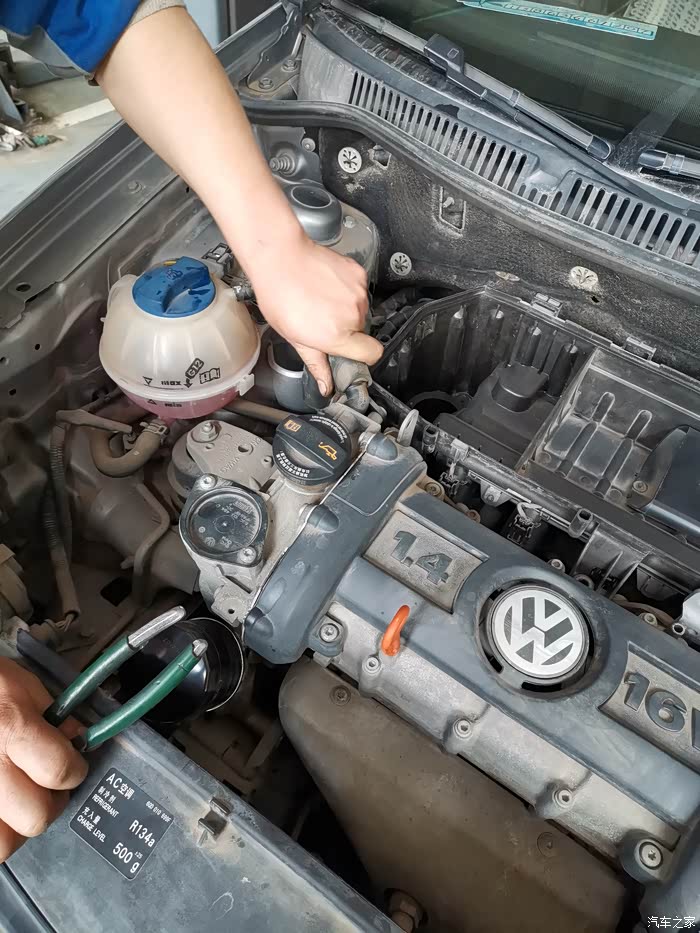 师傅又用钳子上紧节气门与防冻液壶连接软管金属束环,将这个软管按装到位。