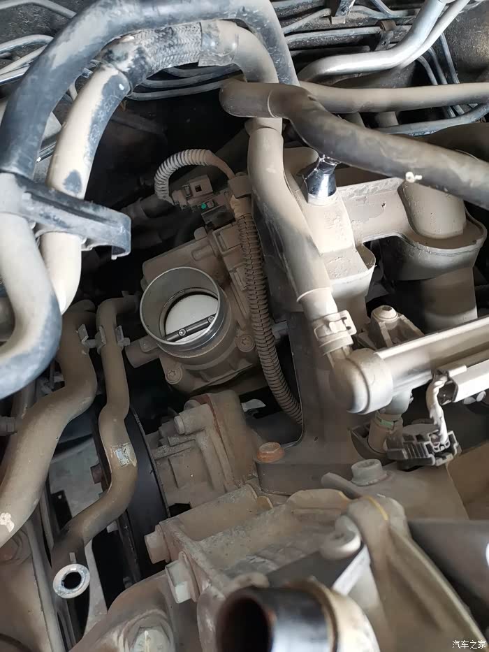 节气门正面不是很脏,背面确实很脏,油泥和积碳之类的东西糊住了。这是节气门背面照片。
