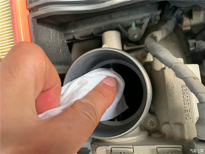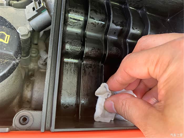 滤芯盒盖里面也要擦拭干净,尤其是节气门上方的连接处。