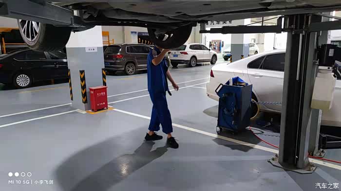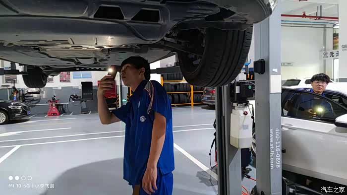 然后升高小朗检查底盘和相关部件,有点不解的是竟然没有拆下护板,就从逢里面用手电照了照,不知道是流程如此还是师傅不原意动手。
