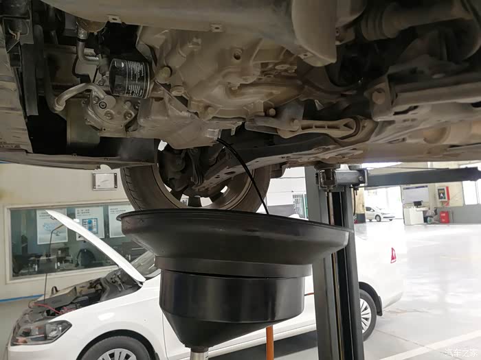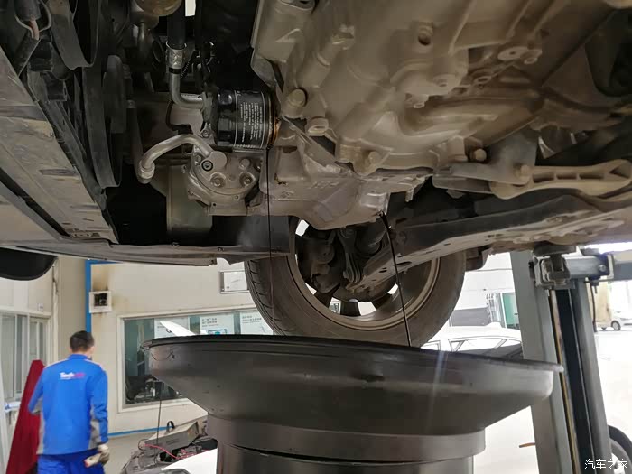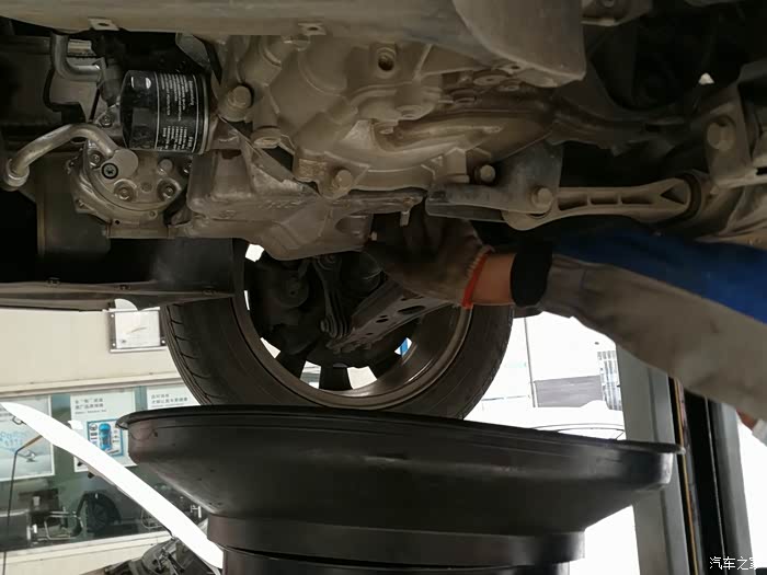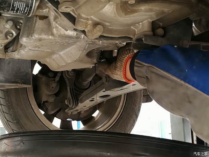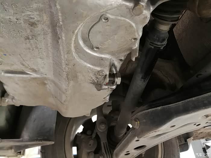接油盆就位,拧开放油螺丝,准备放机油。