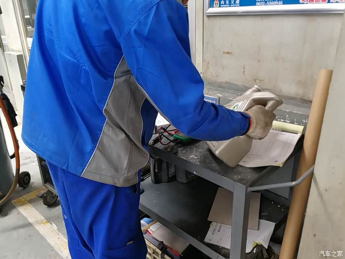维修师傅拿出我带来的全合成机油准备加注。