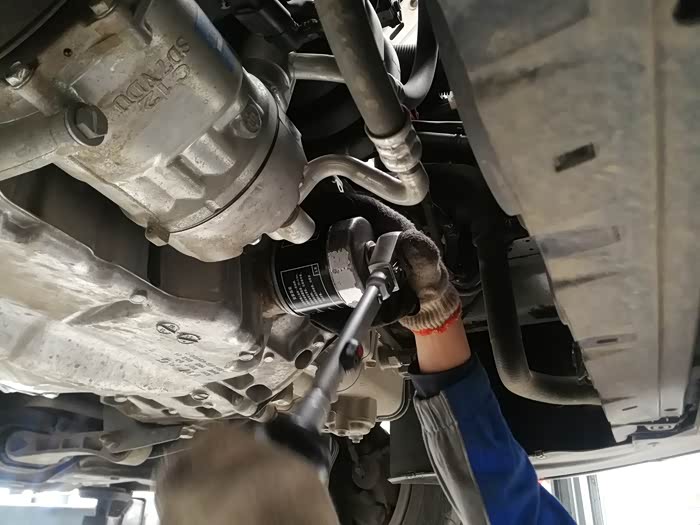 机油流了一段时间后,开始用套筒套住机油滤芯,用棘轮扳手,卸松机油滤芯。