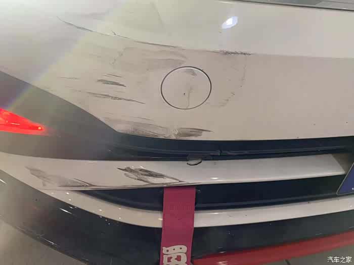 车祸后前杠特写,油漆刮花,雾灯框下格栅损坏,大灯也有划痕。后期大灯准备进行修复处理。