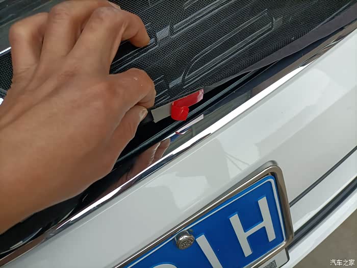 按照刚才预留的合适位置撕去胶皮,把胶粘在车上