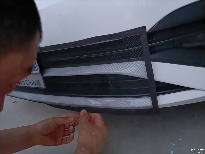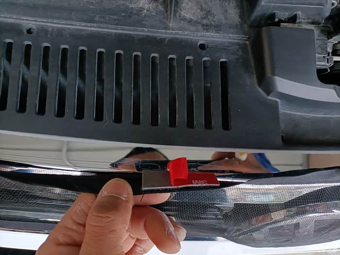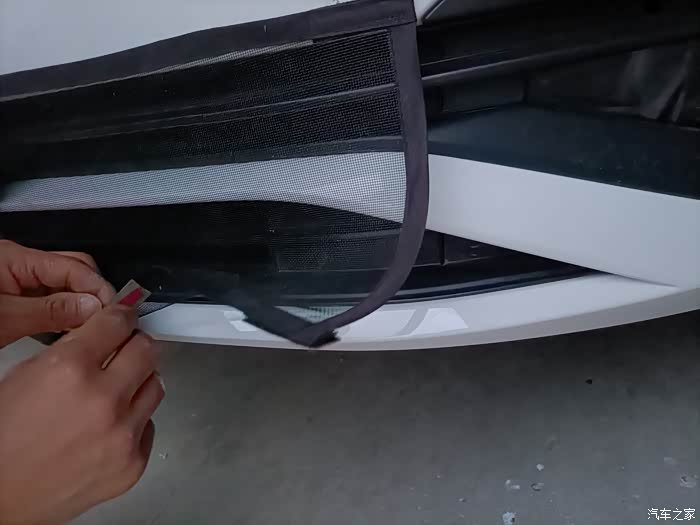 最好是两个人一起装,一人一边先把防护网拉起来找合适的位置点,然后按这个合适的一个一个的把3M胶粘在车上