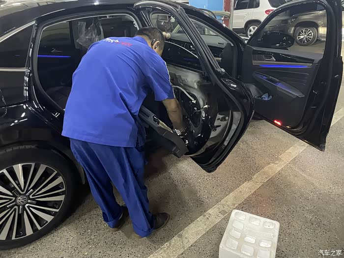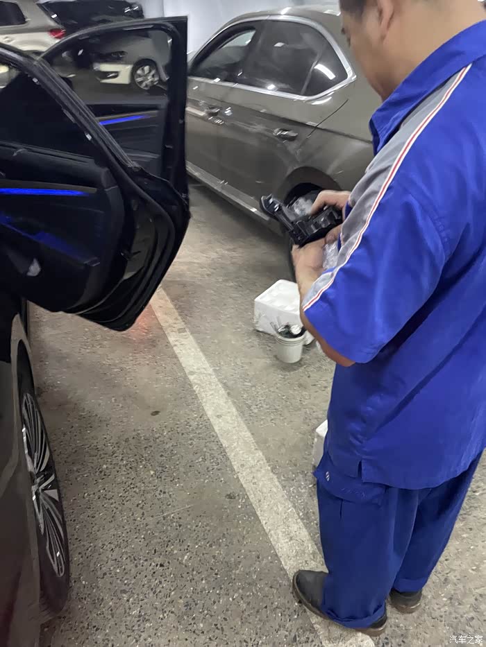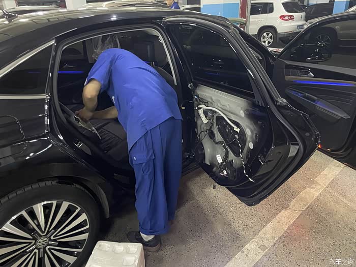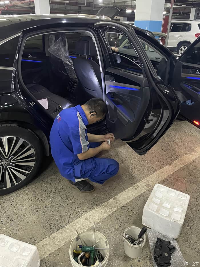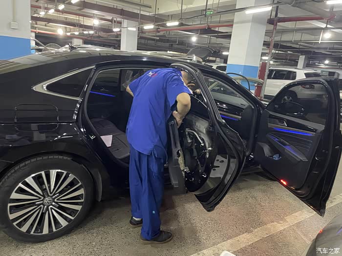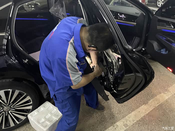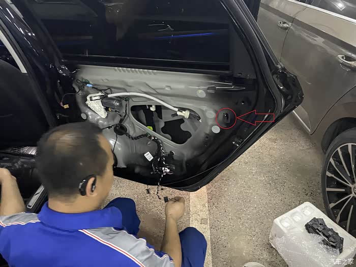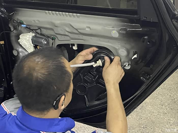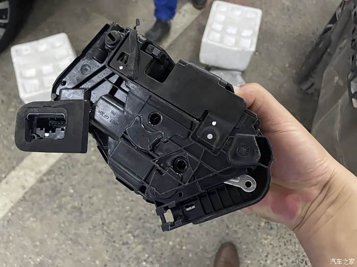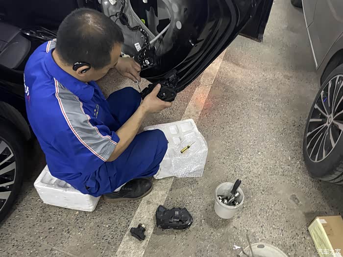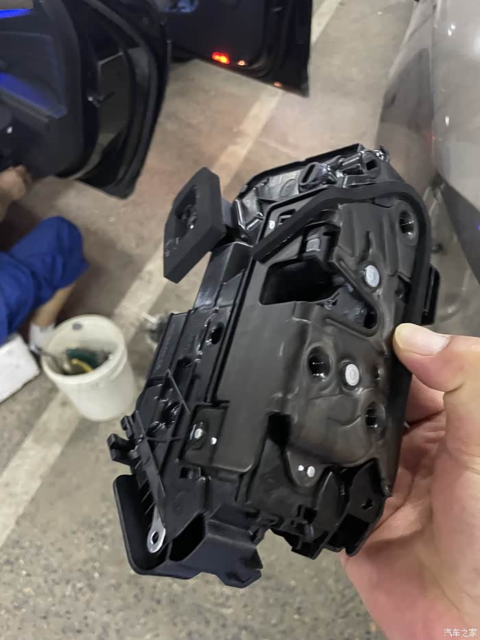 大概订货后的半个月,4S店通知我去店内更换,起初我觉得应该很简单,可到店后直接就让我开到了维修车间,看着边上被拆的七零八落的车,我看是含糊了。维修师傅活挺多的,但手脚还算麻利,拿起单子和配件就开干,到这个时候我才知道,换锁块要把后门拆开的,各种工具上下飞舞,咔吧咔吧声不断,后门内饰板被拆开了,再把中间的三角形橡胶盖撬开,露出了后门防撞梁和一个大窟窿,后面将把锁块从这个洞里弄出来。