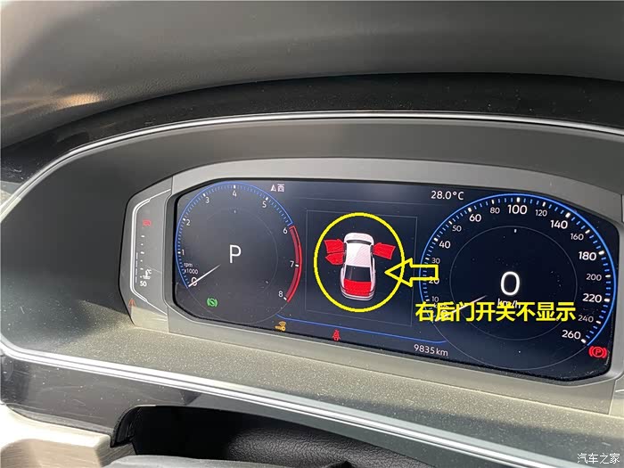 在暑假前无意中发现,打开右后门后仪表盘上没有显示,最初以为是孩子搞得恶作剧没当回事,经过简单测试,除了右后门外,其他的门包括后备箱都能很好的显示出来,心里顿时就不淡定了。为什么呢?因为右后座位是孩子坐的地方也是主要上下车的位置,这要是仪表盘上不显示不提醒,万一在行驶中出现点开关车门特殊情况,那可就严重了,马上到店检查。