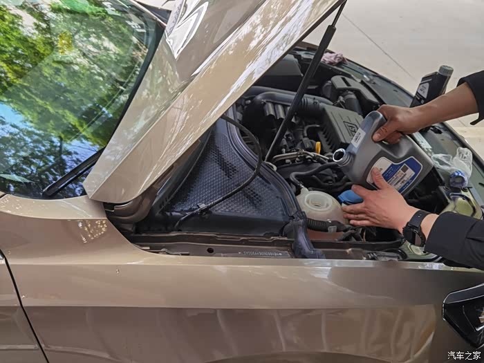 发现新的防冻液和原来的颜色一样,然后慢慢倒入防冻液。