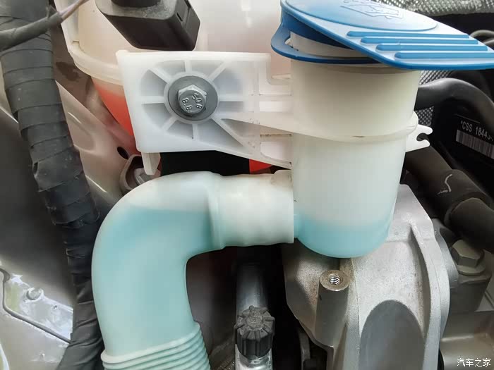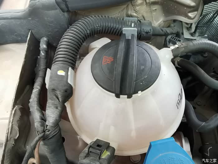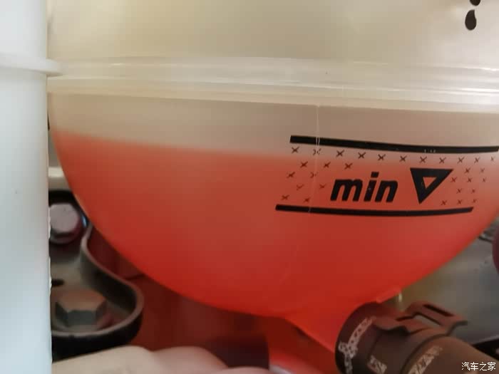 小帕已经快5个年头没有更换防冻液了,这次检查发现防冻液已经在最下面的刻度线上了,奇怪的是仪表盘为什么没有报障。可能是防冻液刚好到最低范围,还没有低于刻度线以下,所以没有报障吧。