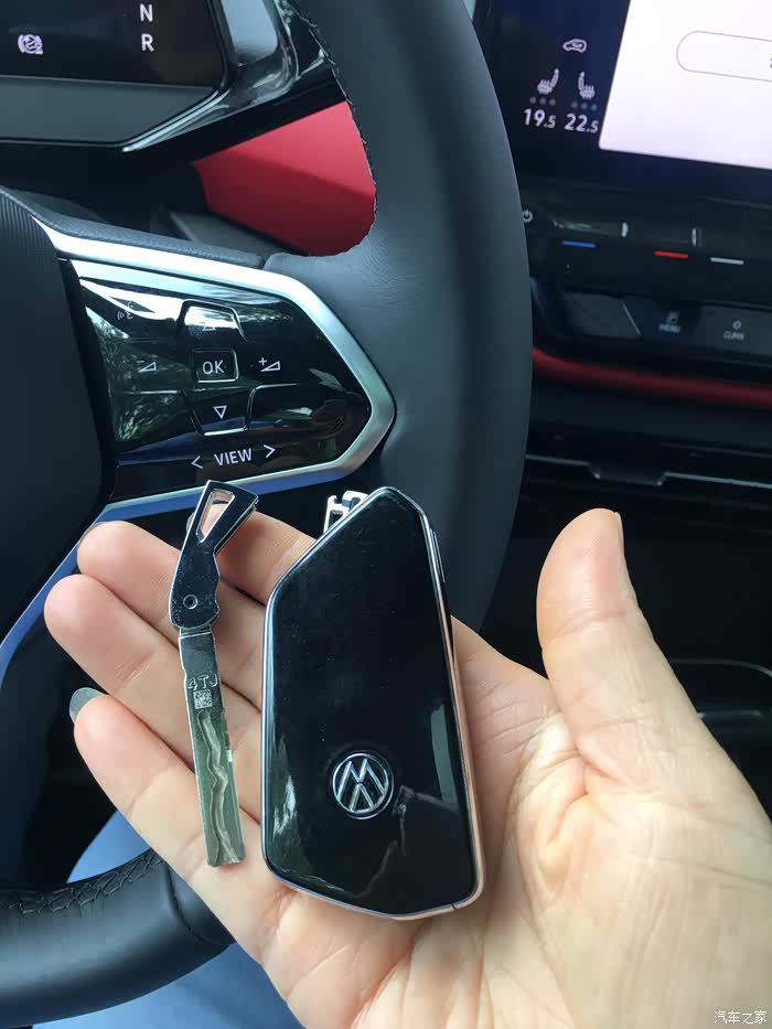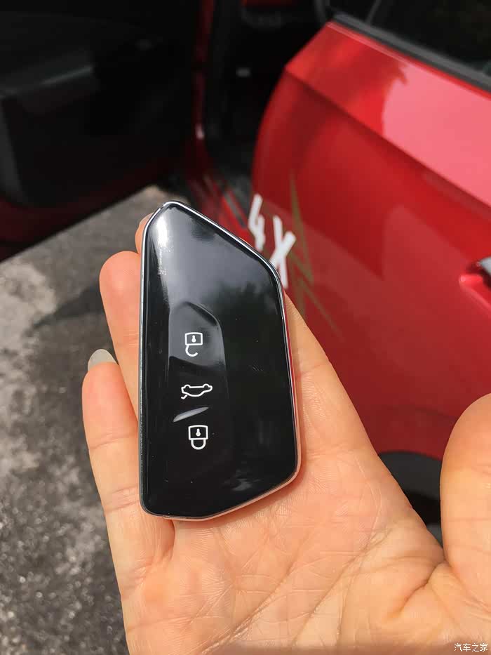 如果钥匙电池没电了,按一下钥匙的侧面 然后往外拽一下就可以将机械钥匙取出来,机械打开车门的。