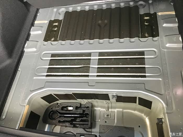 拎起后备箱垫子,看到后备箱里除了一个拖车钩以外没有其他任何东西,这个空间可以自己配一个灭火器。