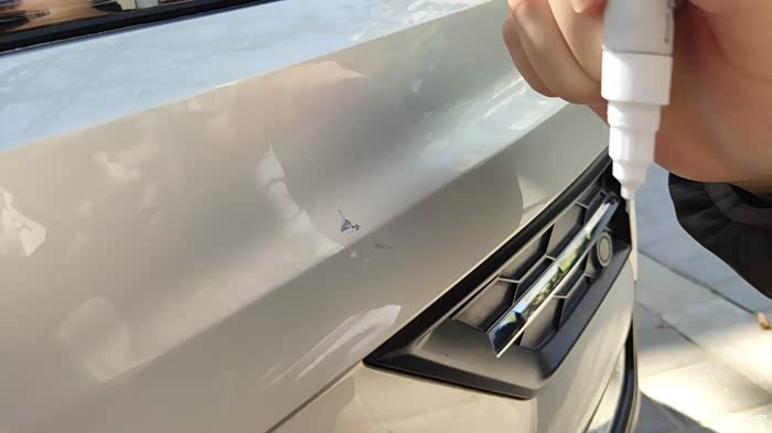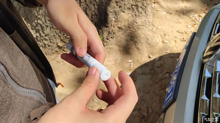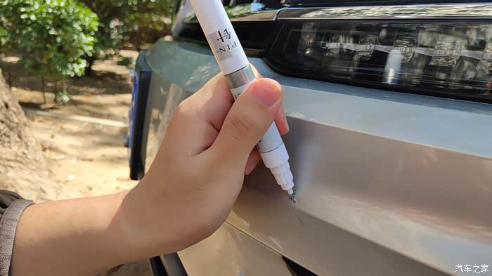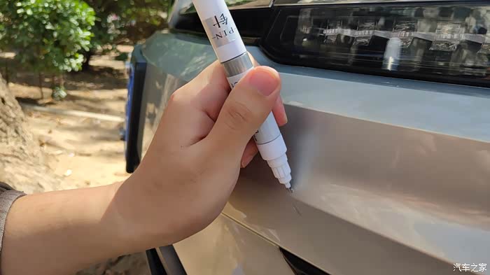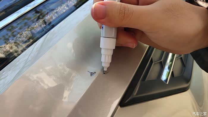 由于是第一次使用,所以严格按照说明书的顺序。首先拔掉补漆笔杆儿上的细钢针,插入补漆笔前边的钢针管,反复往返推拉几下,然后将钢针拔出来,同时用手挤压补漆笔的杆身,这时在钢针管头的地方,出现了与车身颜色相同的油漆,被挤了出来,当然只是一点点,有一股车漆的味道,在太阳光下,油漆中有点点的金属亮点,估计这就是金属漆。
