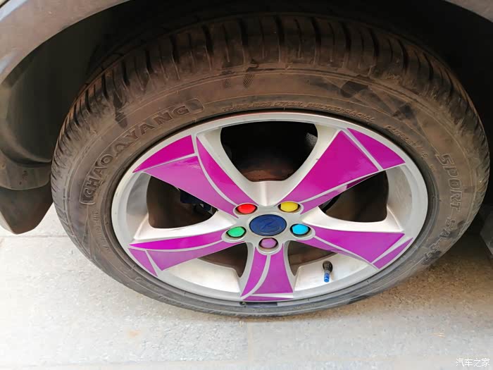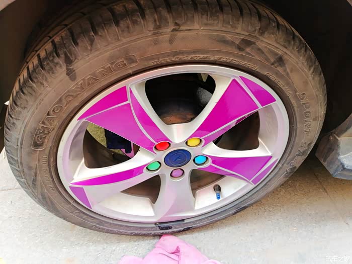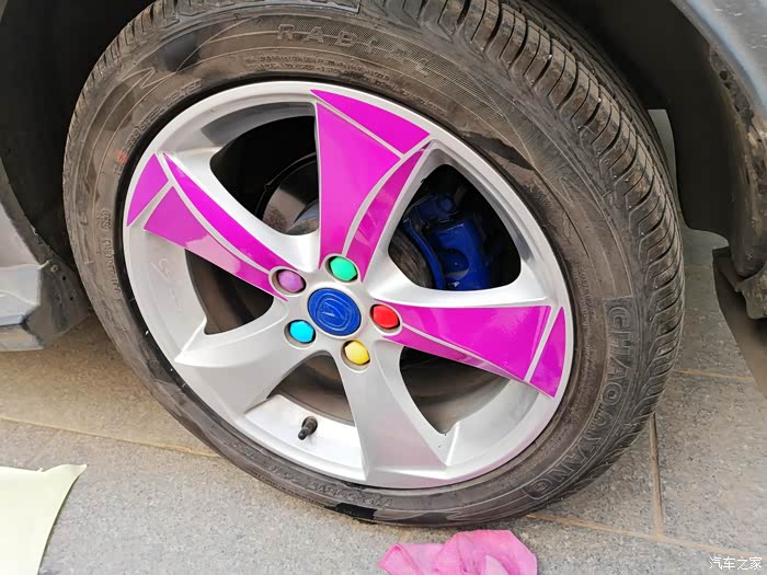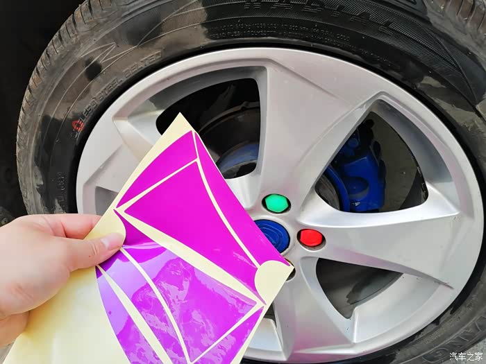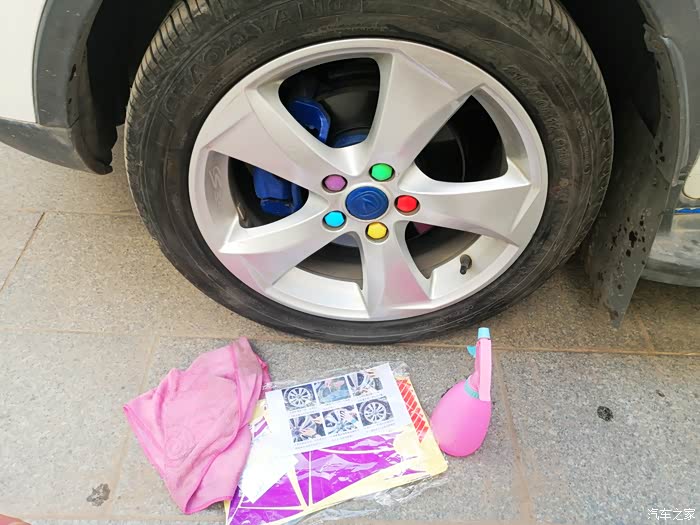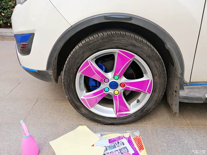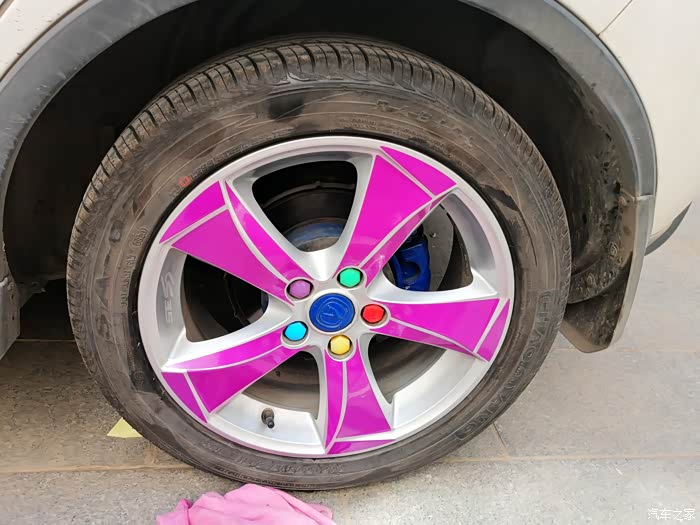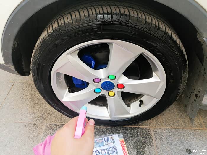 贴完以后,记得两个小时之内不能用车,防止贴纸脱落,最后打算贴红色的圈圈的时候,犹豫了,最后纠结了一下,还是决定不贴红色的圈圈了,下边给大家分享下今天的轮毂改色作业!