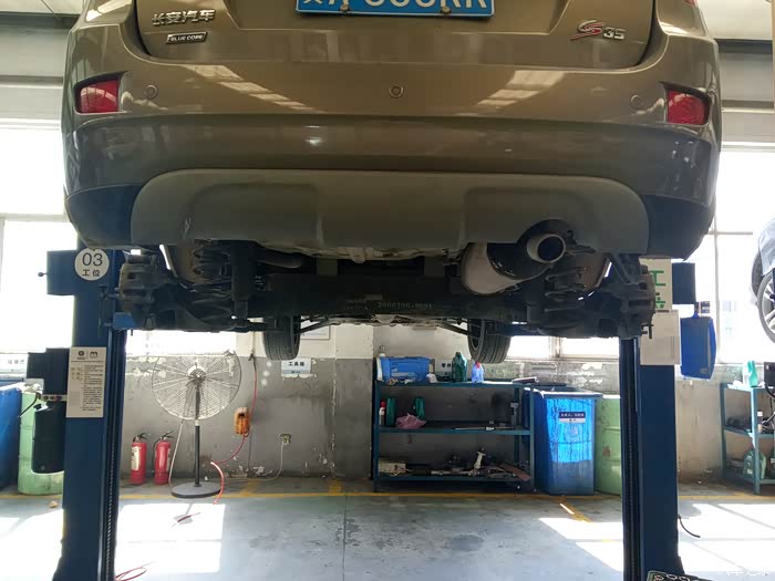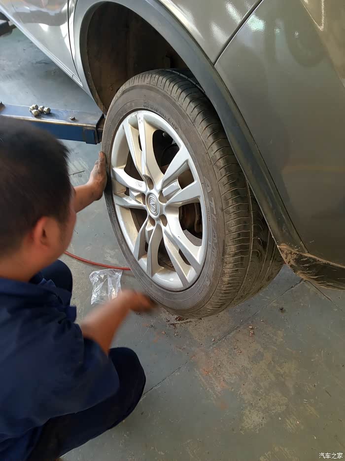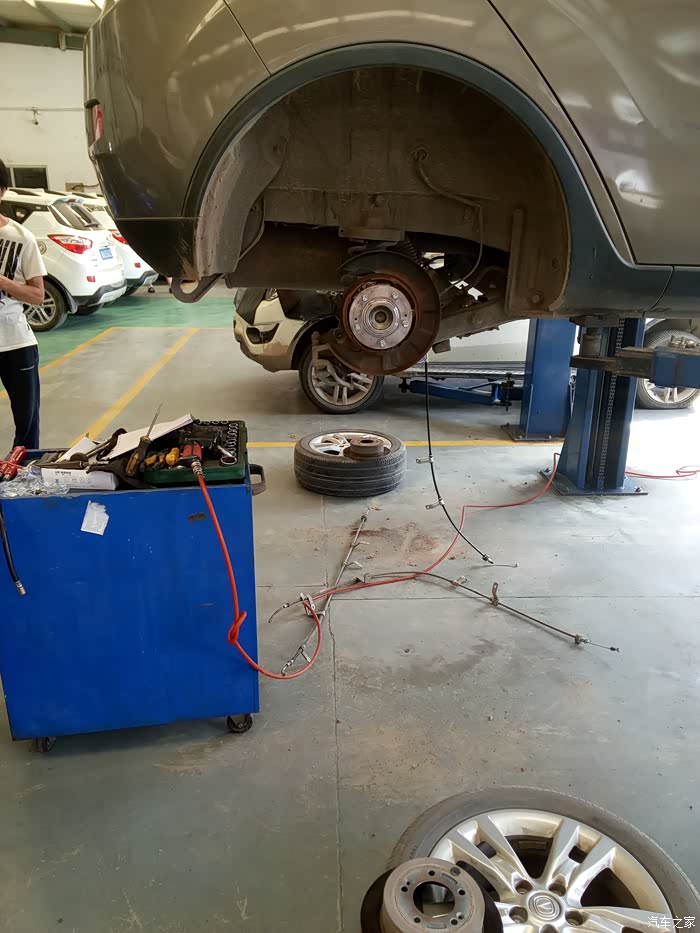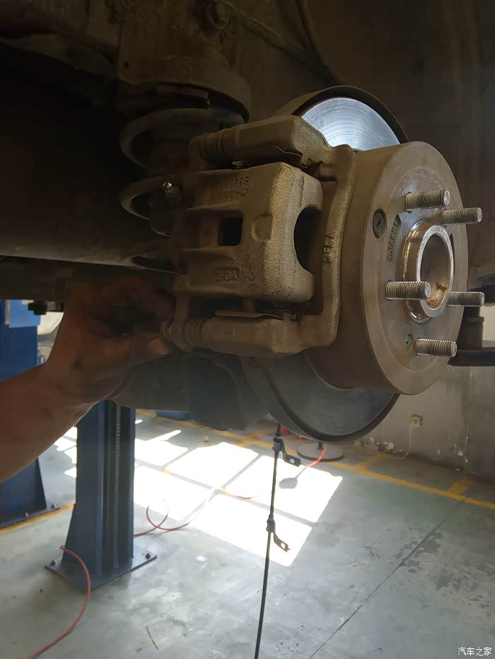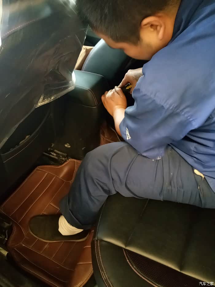师傅开始拆卸刹车,先把刹车线拆了,你别说,长安设计的还是挺科学,在扶手箱下面就可以松紧刹车线