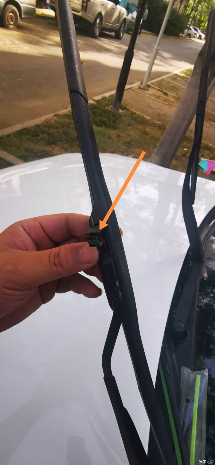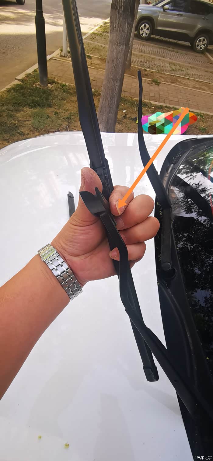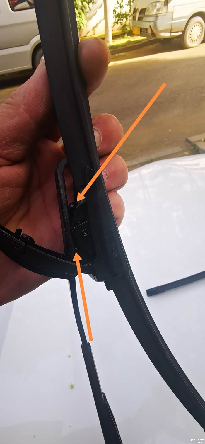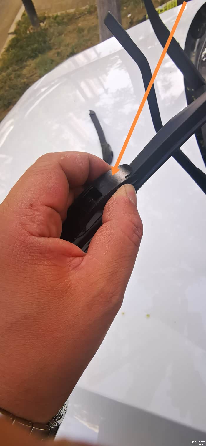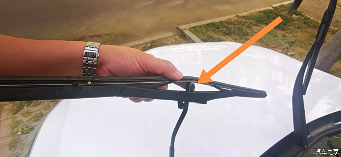 开始吧~先拆掉原有的雨刮片,如图所示~先打开固定雨刮片的配件~